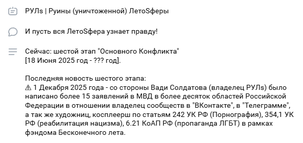 1. ФИСТ - В С Ё ! Во всяком случае, пока. 2. Ожидается Бибофест 19-22 мая. Наблюдаторы с августовской ВС решительно призывают не боящихся деанона провести наблюдаторство за майским мероприятием Бибы. Биба обещает отсутствие коммерции и неадеквата, пристально следим. 3.Биба объявил о сборе своего ВинтерТейла 31 декабря – 1 января. Набега не планируется, по наблюдению информации не было. 4.Штатный швембой провел страждущим лекцию на тему как найти себе тяночку писечку в правацкой лавке "Листва". За несколько дней до самой лекции в лс у Фея объявился шизло на Лохусе, которое обещало отправить "крепких русских парней" к нему на место проведения мероприятия. Однако балабол как всегда слился и не пришёл. С места аноном и Феем ему был отправлен видеопривет, но тот затерпел. 5. После очередного позорного слива Лексус окончательно ошизел и заразил анонов. В итоге вначале его сраньем, а затем поисками Лексуса под каждым кустом был засран весь прошлый тред. ЛЕКСУСА ИГНОРИМ ЖЕСТЧАЙШЕ, даже если он настоящий. Никакой кормёжки вниманиебляди. 6.Комитет Анонимных Легионеров обнаружил и посетилтсычевальню некого Бляди Дилдатова. Этаж оного был украшен меметичным зайцем, пикрил смотреть в шапке треда 7. Вики В С Ë! Некий пидрила залил туда запрещенку и пожаловался сам на себя, в итоге Набеговики была снесена хостом. Всё было архивировано. Ведутся работы над восстановлением. Вероятно этим пидрилой был Блядя Дилдатов. 8. Объявился анон, желающий возродить ведение архива. Скидывайте контент за 2024-2025 в тред, желательно с указанием примерной даты его появления. 9. Продолжается бессрочный конкурс творческого контента. Некоторые аноны даже пилят мод на БЛ и самостоятельную игру. Объявился анон пилящий фигурки персонажей Набега. 10.???