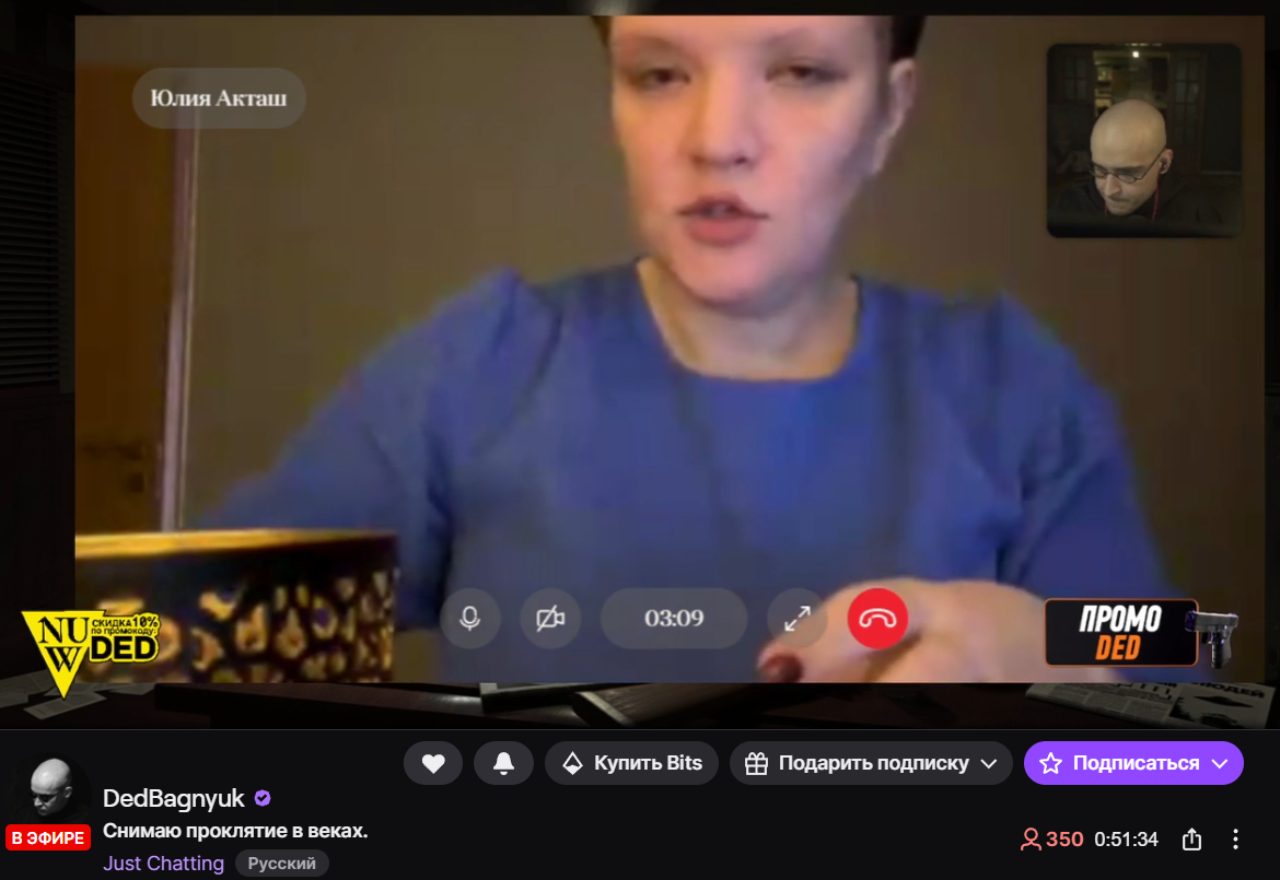 Дед кста будет через 10 минут с гадалкой разговаривать онлайн, закинул 1000 на специальный сайт. Снимет проклятие водолаза. Ждём завоз https://www.twitch.tv/dedbagnyuk