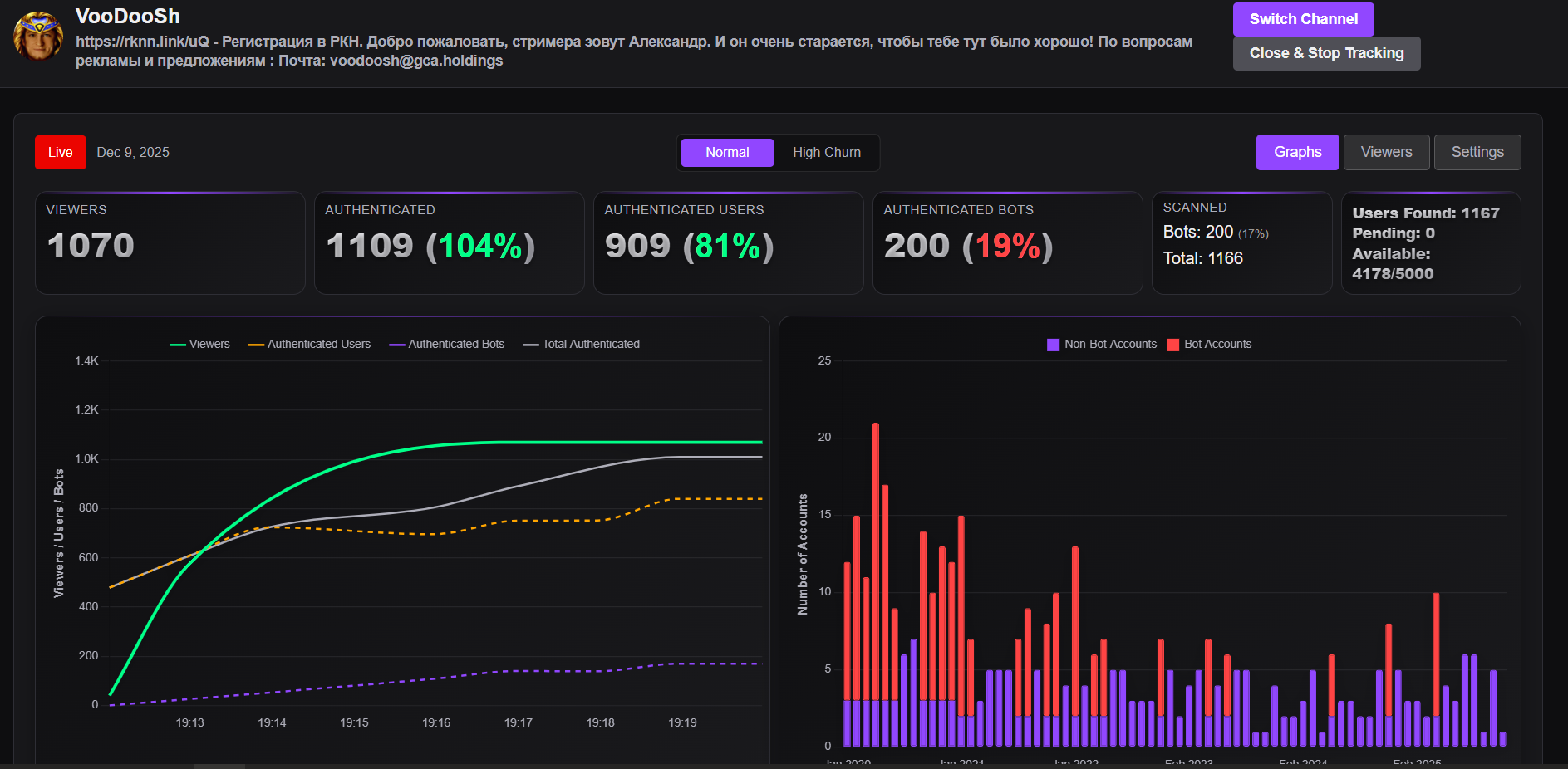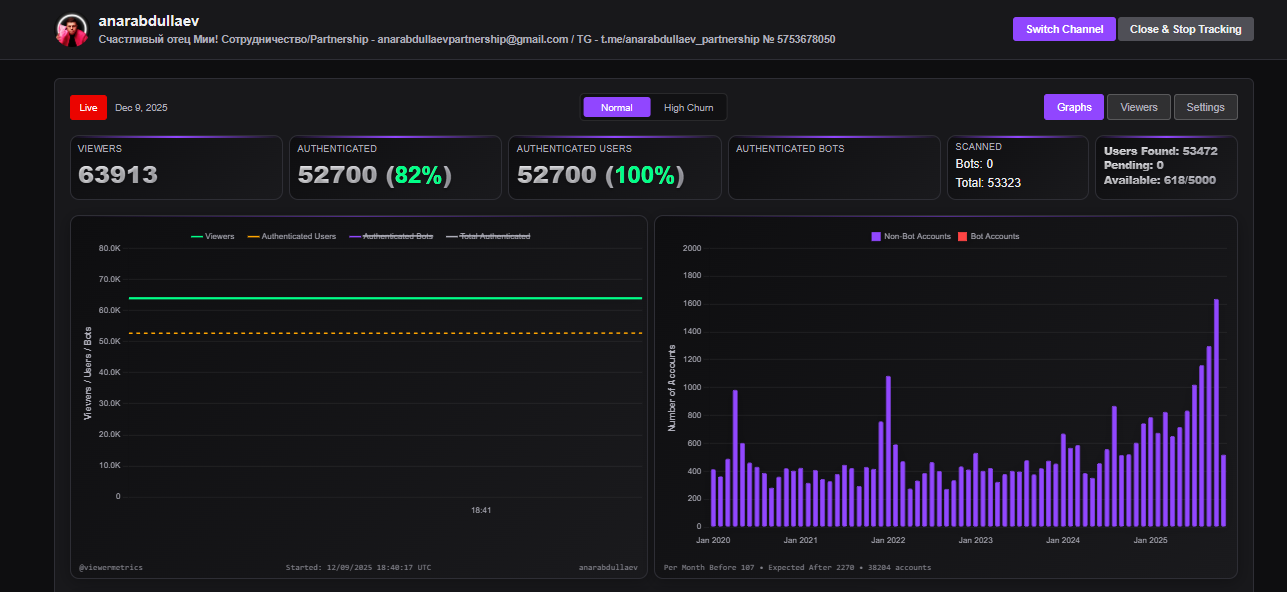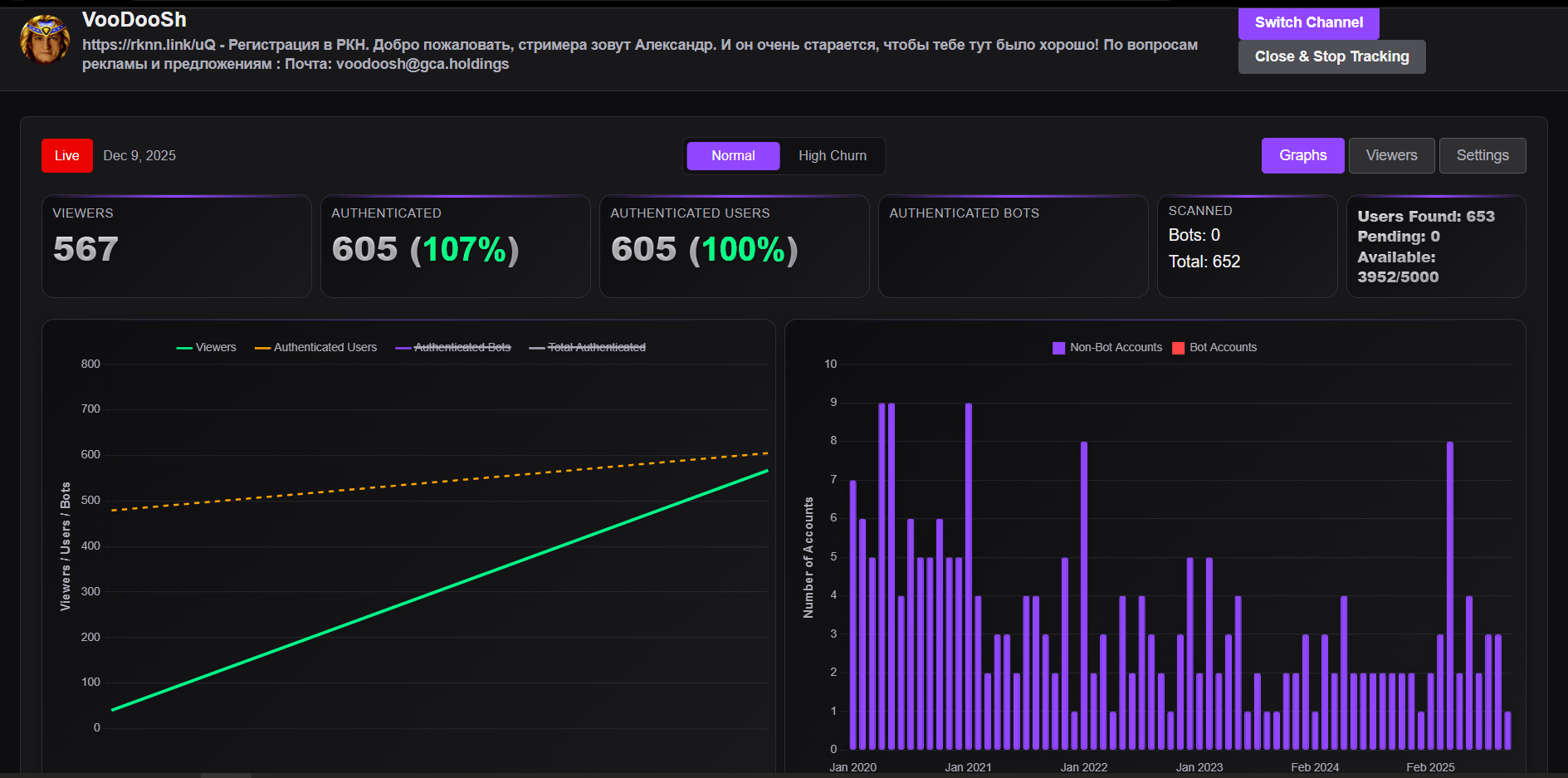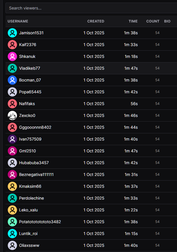 >Отслеживание зрителей Список зрителей загружается с настраиваемой периодичностью (по умолчанию: 5 секунд). Отслеживает время первого и последнего посещения для каждого зрителя. Удаляет зрителей, которые не появлялись в течение 5 минут (настраивается). Загружает даты создания учётных записей для новых зрителей в фоновом режиме.