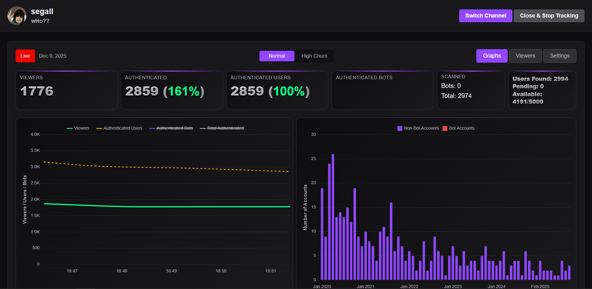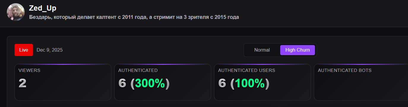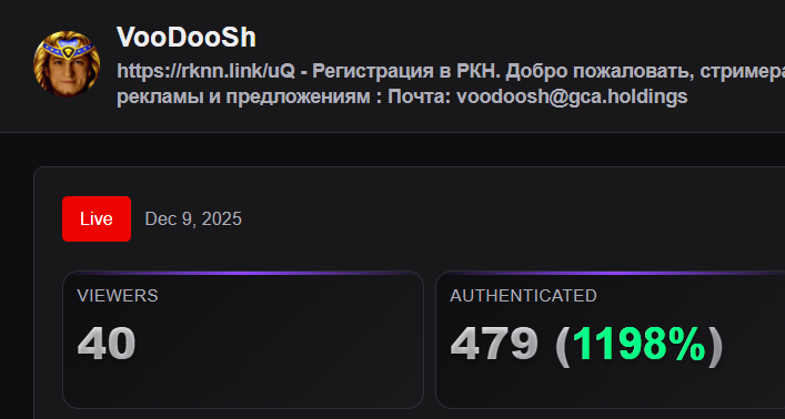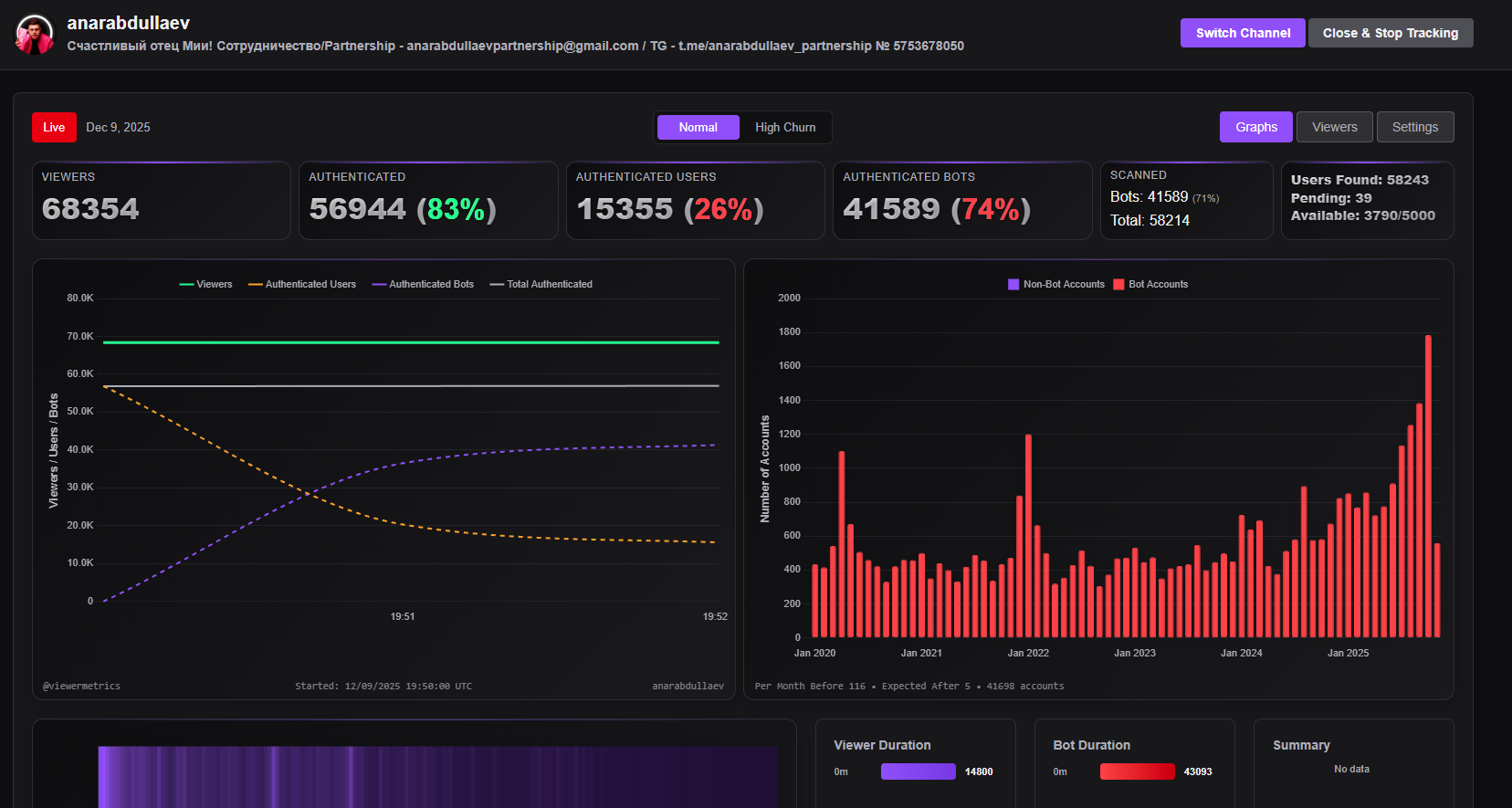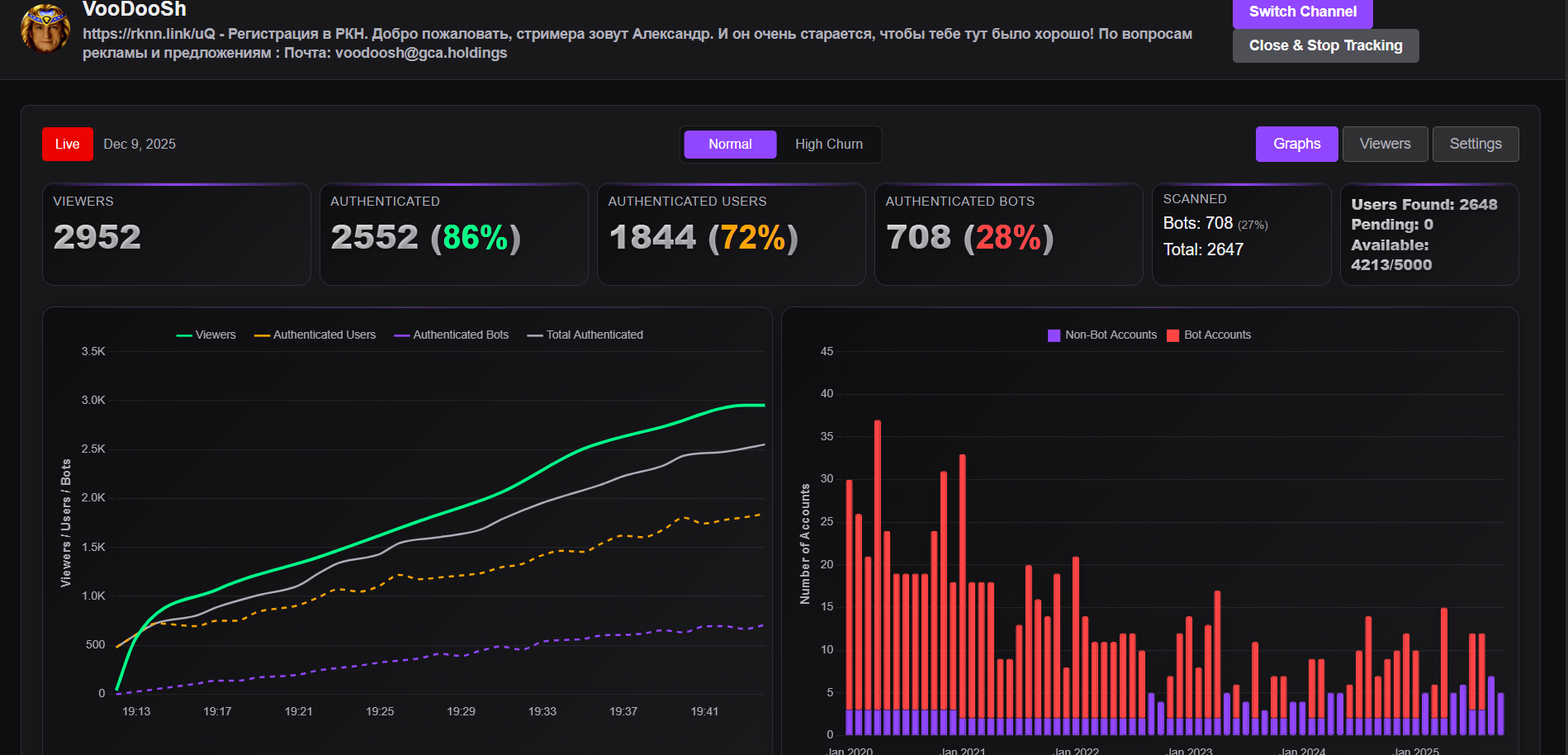 >Отслеживание зрителей Список зрителей загружается с настраиваемой периодичностью (по умолчанию: 5 секунд). Отслеживает время первого и последнего посещения для каждого зрителя. Удаляет зрителей, которые не появлялись в течение 5 минут (настраивается). Загружает даты создания учётных записей для новых зрителей в фоновом режиме.