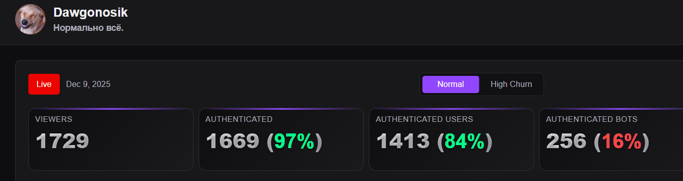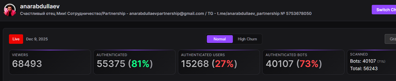 Все надоело чмудуша мониторить. Накрутка у него динамическая и зависит от количества живых зрилов. Это работает идеально, в чате есть активность, а то что там разбавлено 700 ботов не роляет иначе говоря НЕ ДОКАЖИТЕ