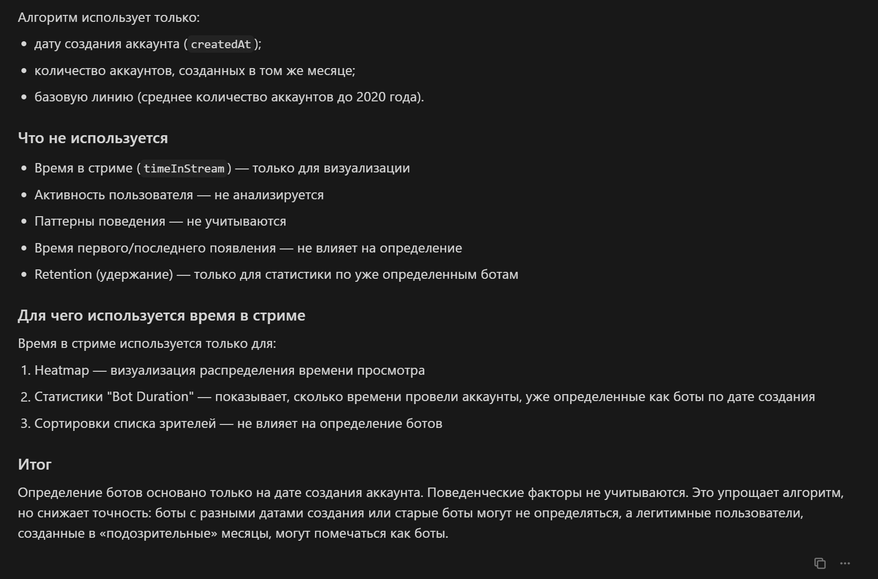 >Алгоритм расчета базового уровня: Анализ до 2020 года: Анализирует закономерности создания учетных записей до 2020 года. Установление базового уровня: Рассчитывает максимальное ожидаемое количество учетных записей в месяц после 2020 года. Обнаружение пиковых значений: Определяет месяцы, в которые количество созданных учетных записей значительно превышает базовый уровень. Автоматическая классификация: Учетные записи, созданные в периоды пиковых значений, помечаются как потенциальные боты, игнорируя половину базового уровня как реальных пользователей. Удаление ложноположительных результатов: Отображается только итоговый процент ботов, превышающий 10%.