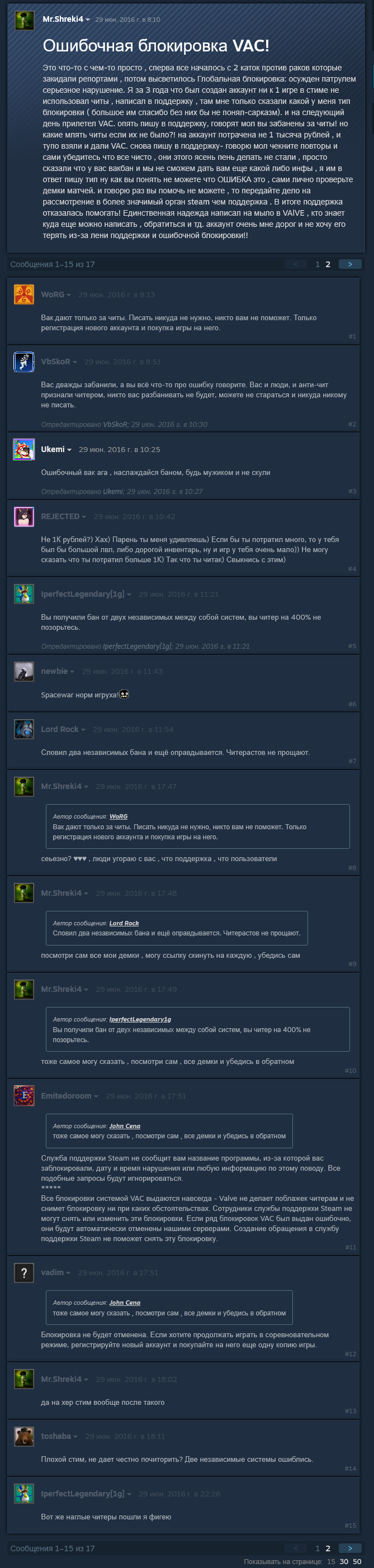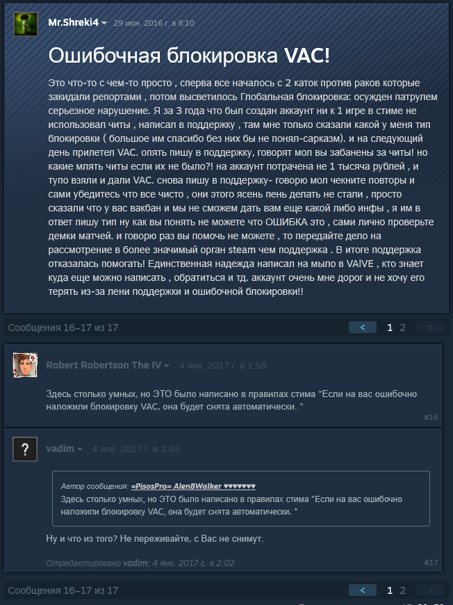 смотрите какая забавная хуйня: чел в 2016 году говорит, что его забанили по ошибке и дали вак бан, готов даже показать какие-то демки. в комментах соевые подсосы и шлюхи габена усираются про то, что святой валв не может никогда ошибаться + 2 независимые системы блядь какие-то посчитали его читером (орунах). т.е. это говно среди обычных игроков-людей, которые вокруг нас, никто из них не верит в то, что ебаная античит система может дать сбой, как и любая другая программа.