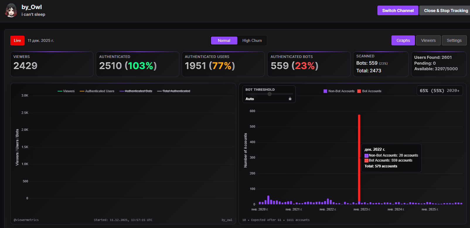 >>25769782 то событие с онлайном в августе и то что сейчас детектят на накрутку вообще никак не связаны. естественно у них не 100% живых людей, такого ни у кого нет везде боты. просто когда например на 20к 100-200 ботов наверное просто в статистику не считает. например у мокривского сейчас мартовская база 250 ботов на стриме сидит