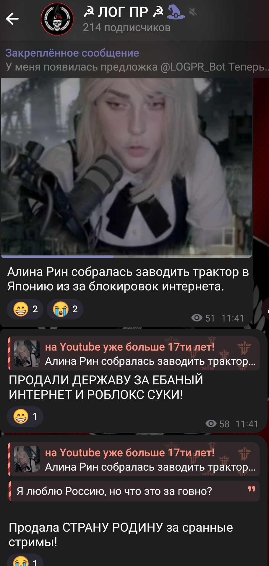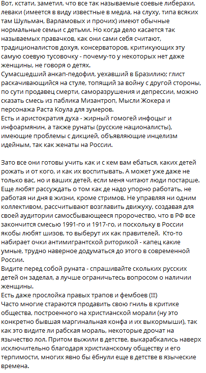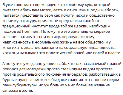 От себя хочу сказать, что так неловко становится, когда его телегу читаешь. А особенно посты про баб. Как будто человек 24/7 дрочит и ведёт в канал прямую трансляцию того, что он бормочет пока дрочит.