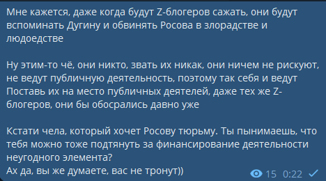>Зачем мне тебе донатить? Ты состоишь в иноагентской организации "Гроза" Николая Росова, которая устраивала книжные клубы с целью формирования временного правительства и покупки оружия.