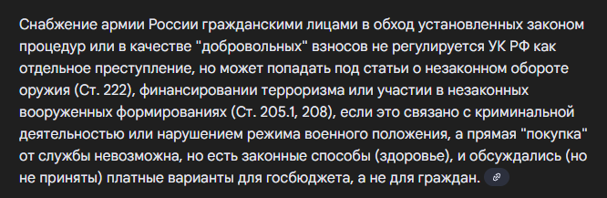 Если ты делаешь срочносборы, тебя будут по ст.222 ебать, так как ты не представитель правительственных структур и не должностное лицо, а сранный "общественник" >Я так понимаю третья ссылка это про покупку автоматов, если мы допустим что кто-то делал сборы, то там нет ничего про ответственность тем кто донатил, а только классификация про использование сети Интернет для покупателя. Не только автоматы, и тепловизоры проходят и даже ебаная рукоятка или приклад. То есть ты просто снабжаешь людей около-боевым снаряжением, ты уже подпадаешь по сути. Мне кажется даже аптечки посчитают, как снабжение вооружением людей при желании.