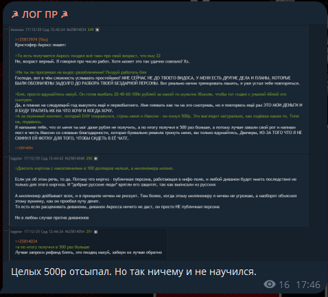 >Готов поставить на то, что создают прецедент, чтобы оправдать "доксинг" меня)) Нужно записать видео, где ты выражаешь ноту протеста и осуждаешь Максин, объясняя почему с ней не стоит иметь дел, иначе пойдешь соучастником.