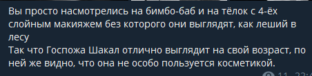 >Ты присматривался к женщинам вообще? Удивишься нахуй, у многих есть мужские черты лица, особенно с без подкрашивания глаз Как неожиданно... А ещё, кстати, у кого-то это ярко выражено, а у кого-то менее... Может хватит страдать охранительством или она тебе за такое платит? >так как Шакал затравила аудитория Мудисьона Осуждаем. >вы туда же, начали докапывать, НЕ учитывая, что она БЕЗ макияжа Мне не зачем навязывать другим то, что вижу лично я у себя перед глазами... Не ведись на субъективщину, особенно из-за такой мелочи как внешка