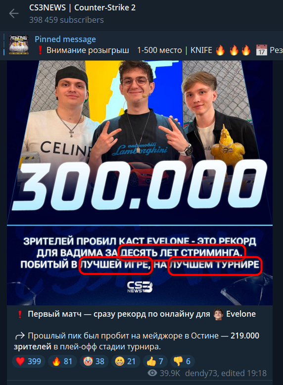 положняк такой... онлайн 400к легитимен на турнире по ксу (первый день плей оффа, на финале должно быть в 3-5 раз больше) ПОТОМУ ЧТО 1) 10 лет стриминга 2) лучшая игра 3) лучший турнир