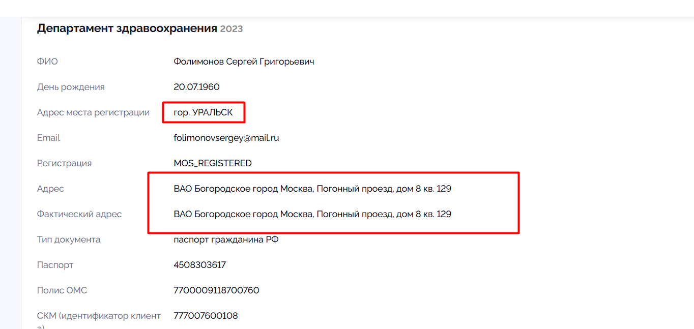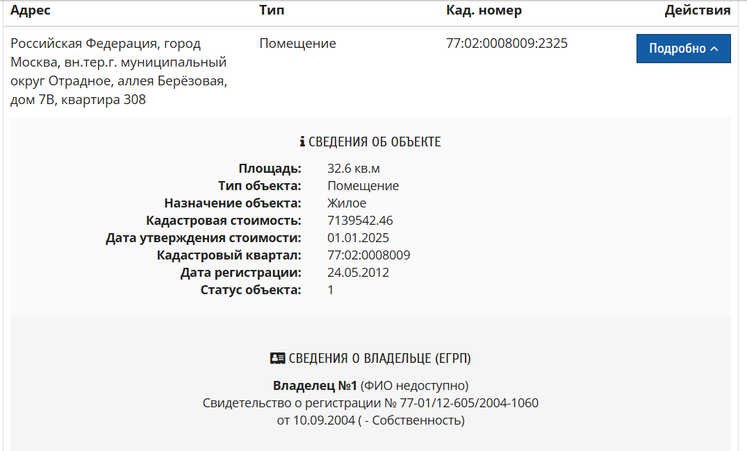 Данные из Росреестра за 2024 год. Указанный здесь адрес находится в Богородском районе, где ему был выдан паспорт, что указывает на то, что он как минимум регулярно его посещает, а, сочетая с ранее полученной информацией о нахождении его симки в 170 км от точки в Рязанской области, мы приходим к выводу о его реальном проживании там. Расстояние от Москвы до Рязани 200 км, Рязань находится в самом центре рязанской области, к слову.