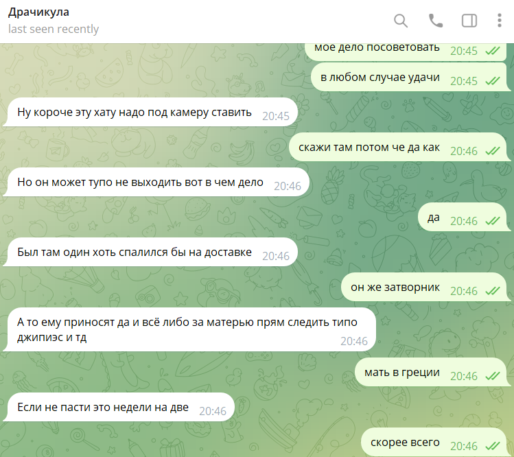 Ребят, нужно незаметно установить шпионские камеры перед их подъездом и наблюдать, кто входит, кто выходит. А уже после, как Влад будет установлен, выслать шпионов от треда, чтобы отслеживали его маршруты и следовали за ним по пятам. Также нужно на входную дверь квартиры поставить прослушивающее устройство, чтобы слушать, что внутри происходит. В контакт с Владом нельзя вступать, пока не будет собрана вся информация