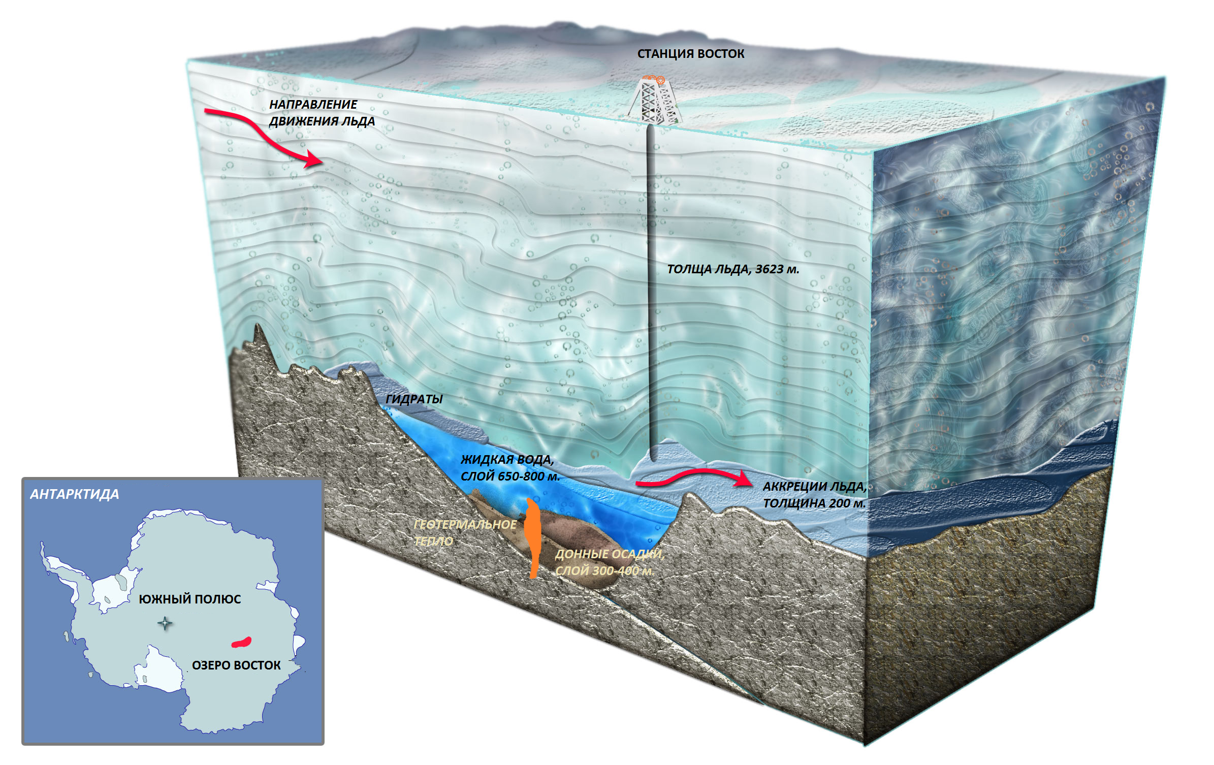 Озеро Восток расположено в районе антарктической станции «Восток» (77° южной широты, 105° восточной долготы) под ледяным щитом толщиной около 4000 м и имеет размеры приблизительно 250×50 км. Предполагаемая площадь 15,5 тыс. км². Глубина более 1200 м. Объём воды — около 5400 км³[2].