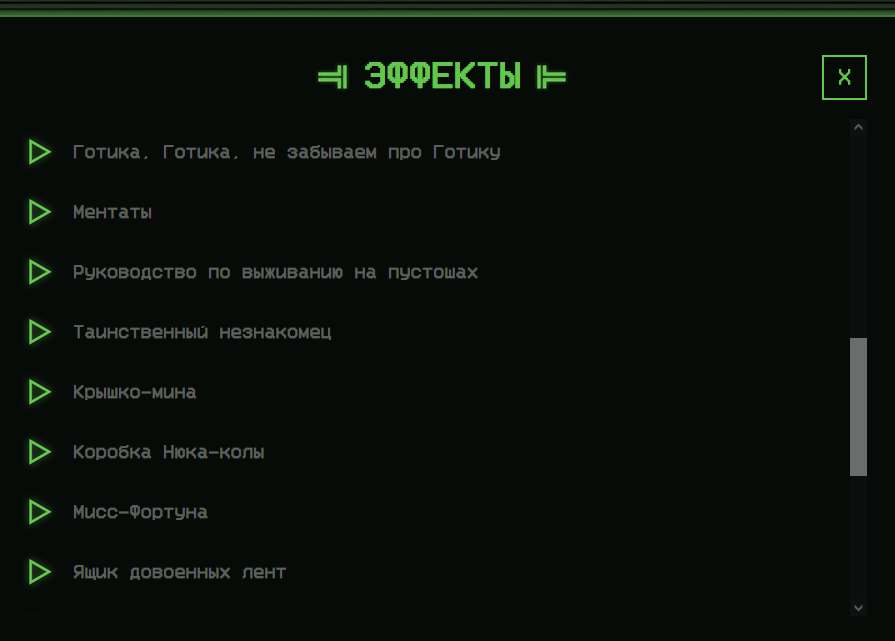 Список эффектов вы можете посмотреть в разделе "Эффекты" на главной странице сайта.