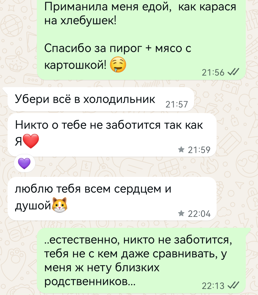 я прекрасно понимаю и уважаю, что для тебя важна физическая близость и тактильность — это естественная и прекрасная часть отношений. но я больше не могу быть частью этой динамики, это было бы предательством и по отношению к тебе, и по отношению к своим новым убеждениям. я также осознаю, что не готова даже помышлять о браке в ближайшие годы — мне необходимо пройти этот духовный путь самостоятельно, без партнера. я вижу возможность создать семью только лет через десять, и просить тебя ждать все эти годы — несправедливо и неправильно.