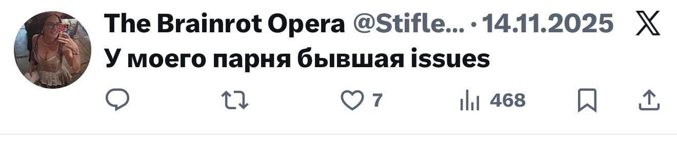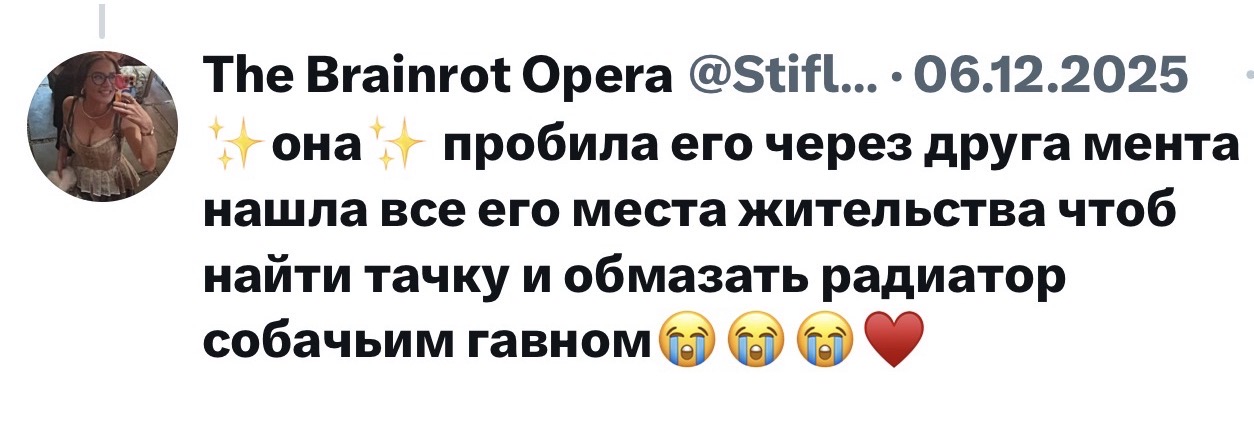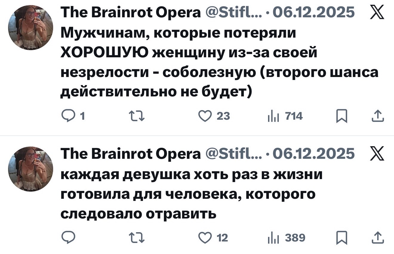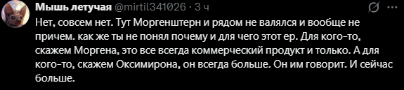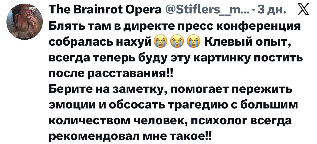 А вдруг у окси на самом деле все хуево. Реально рак какой-нибудь. И он решил перед смертью приколоться, мол, да не, у меня все хорошо, отдыхаю под пальмами, болезни никакой нет... Я сейчас расплачусь девочки... А потом он решит передознуться чтобы не умирать медленно и мучительно. И все будут гадать к чему был кринж альбом. А другие вспомнят строчки про это был не передоз и не самоубийство. Но это реально будет он потому что окси траванули какой-то хуйней и теперь он неизлечимо двигается к смерти