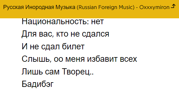 А у мирона национальность вообще не смешной кал и неслушабельный как просто реп. Эту хуйню никто в здравом уме включать не будет уже через месяц. Это хуже семейного альбома который тоже неслушабелен. Но там хотя бы не так стыдно было слушать его