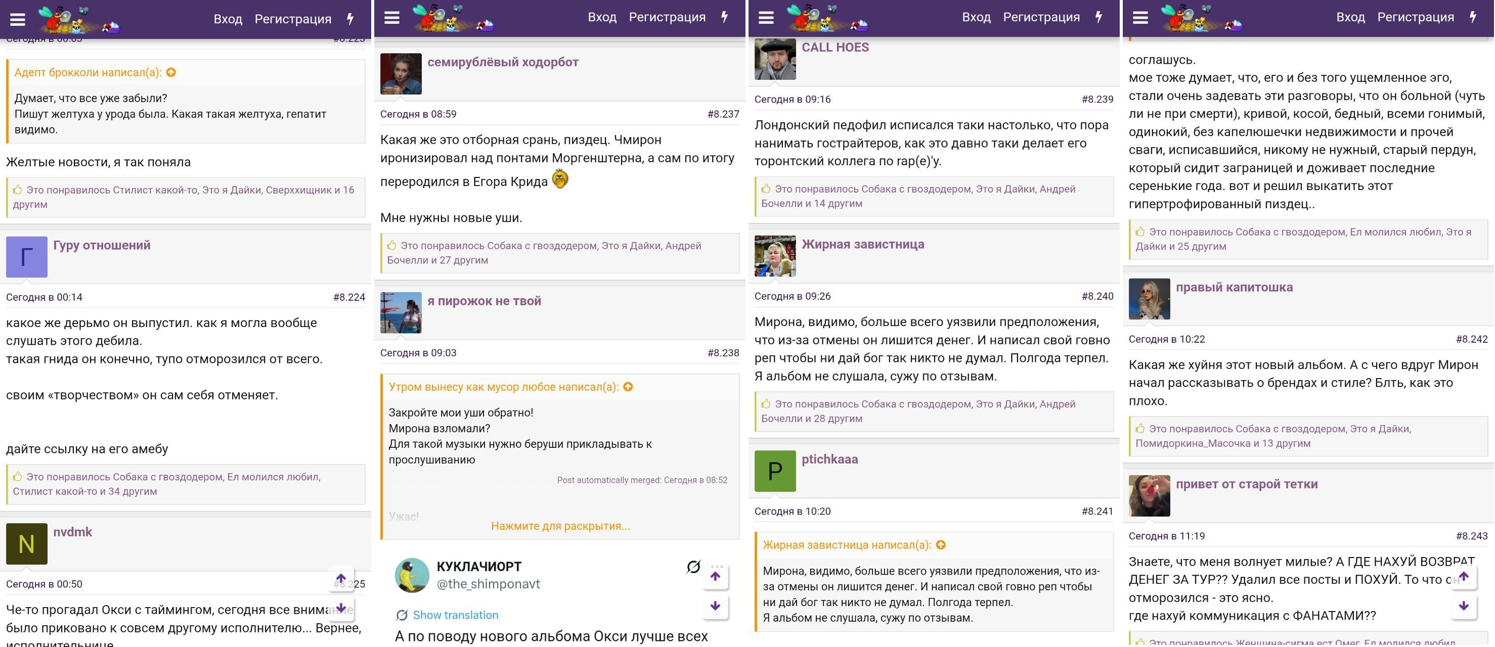 Быстро, нахуй, открыл все ссылки, которые я тебе скинула и читай, нахуй. Уёбок, блядь, хуесос конченный. Сука, из-за тебя пидораса, блядь, у Димы очко сгорело нахуй. Он меня пас с первой моей фотки раком, блядь. Он тёк по мне. Он себе искал, ждал, блядь, покорную казашечку, нахуй, чтобы её ебать жёстко, нахуй. Ты даже это не мог понять, то что Дима тебя заебал этими вопросами - "что с Викой?", "как с Викой?", блядь, куколд ёбаный. Твой друг, блядь, товарищ сломал жизнь твоей бабе, нахуй. На которой ты жениться собрался, с которой ты, блядь, дом в Лондоне собрался покупать, хуесос ты ёбаный. Блядь, Мирон, какой же ты жалкий, сука! Живи, нахуй, со своей НЛОшкой обосранной. Вот ты её и достоин, два пидораса, блядь. Хватит мне жизнь, нахуй, портить. Я только, блядь, начинаю нормально жить. Только, блядь, начинаю находить нормальную работу. Ты пидорас, блядь, со своей хуйнёй ебаной, блядь, лишаешь меня всего! Лишаешь меня мужика! Лишаешь меня четвёртой работы подряд, блядь! Будь ты проклят, уёбок ёбаный, блядь. Трубку возьми, нахуй!!! Возьми трубку, хуесос обоссанный. Я от тебя, сука, не отстану. Я, сука, от тебя не отстану! Мой батя сказал, что он тебя утопит, нахуй. Понял меня, блядь?! Он тебя, блядь, якорем ёбнет и утопит тебя в лодке, хуесос блядь.