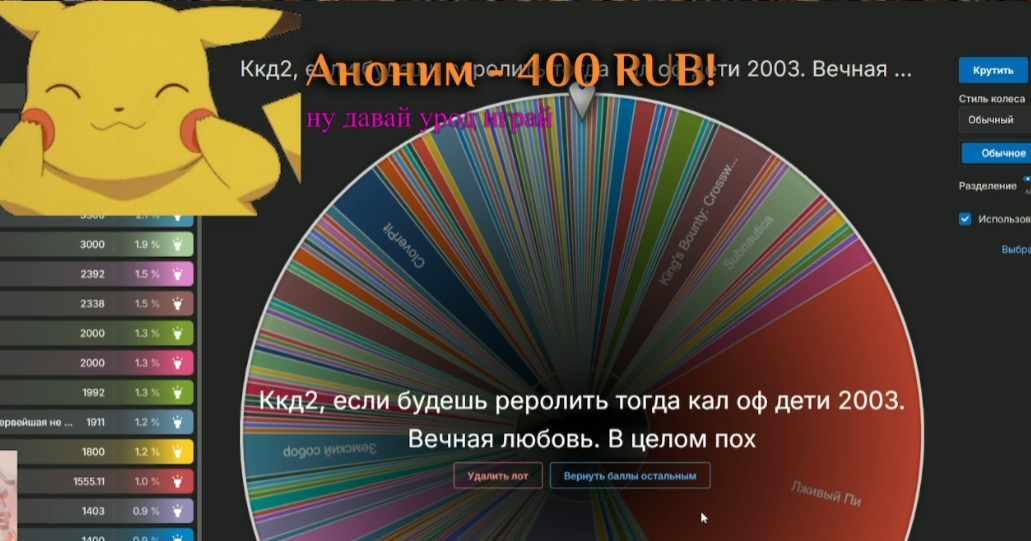 Кто вообще до сих пор думает, что увеличение своего сектора на колесе увеличивает шанс выигрыша? Вы ебанутые? Если хочется что-то заказать закиньте минимум, там нахуй ваши завозы по 100к не влияют ни на что
