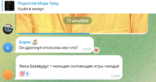 Я в ахуе, как тетя соя кинул пацанов, которые разрабатывали вместе с ним какую-то игру, он просто расплакался, сказал, что выгорел и просто дропнул это дело, а за все вопросы на стриме отмалчивался, потом говорил, чтоб закрыли тему и дальше начал просто банить молча.