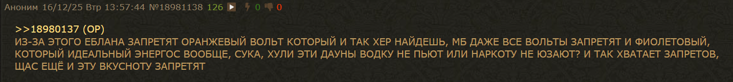 >>25806290 Гандон сраный. Из-за него щас отменят оранжевый вольт, а это лучший цитрусовый энергос, который и так хуй найдёшь. Или вообще вольт запретят, а фиолетовый вольт один из лучших энергосов также. Говнюк ебаный, лучше бы водки выпил, или веществами закинулся. Надеюсь, что его опустят в тюрячке