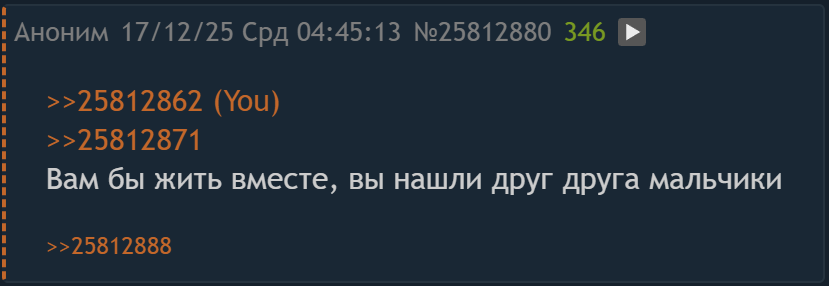 >>25812741 ему приносят его пост, он бежит перепощивать и радоваться, ему говорят, что это он и срет своим же постом в очередной раз, на что он агрится и говорит НЕТ ТЫ блядь ебать ребенок боже