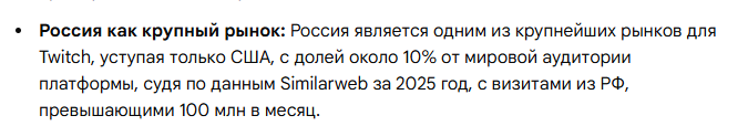 >>25813588 мб потому что официально статистика говорит о том что 28% всей твич аудитории (стримеры, зрители) это северная америка? а россия еле еле 3% набирает