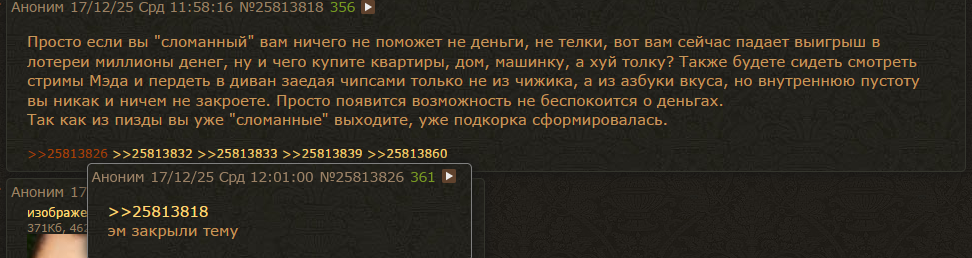>>25813252 >видно было, что это напускное, и перед этой самкой в глубине он коротит и нервничает. А мне наоборот показалось, что > слойку накидывать про шлюха в шкафичик и жирную свинью Это был топ контент и Илюха завозил, он еще про Жирин шутил, насчет тортов и т.д., а вот "ужимки" были фейковыми и тож попыткой наебать, чтоб подумал кто, что ему неприятно, когда он сидит слойками сыпит, которые полтора человека поняло, до рин еще лет 5 будет доходить что это было и не дойдет, если ей детальный разбор не скинут с пояснениями Да никто в чате даж не понял