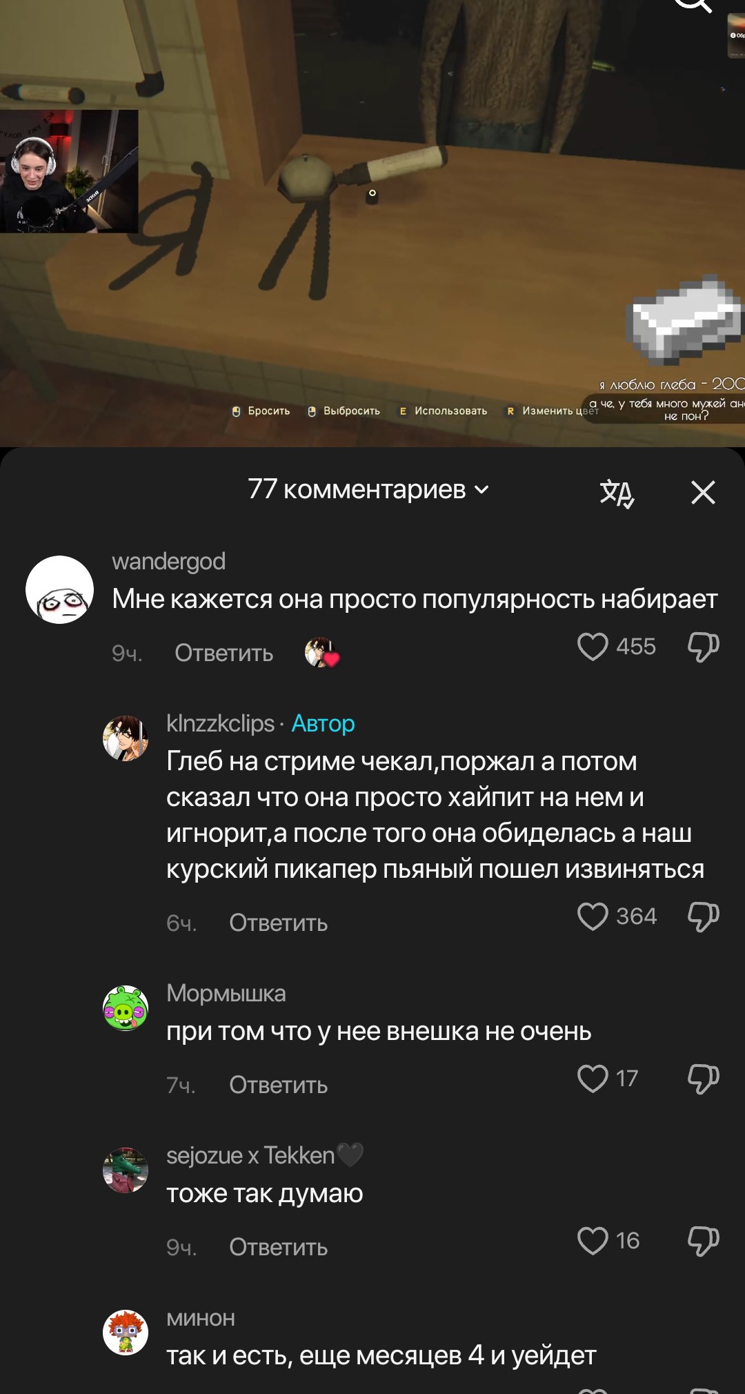 "найс она на контент играет, а в жизни тебя динамит, Глеб. Она просто ловит с тебя хайп" - хелин Если даже подсосы сасавота это понимают нахуя он ее рядом держит? Или он посмотрел на жида который предложил шип контент морфилине и решил провернуть такое же? Правда он почему то сам не видит, что личного профита 0, только кутировер фейм лутает