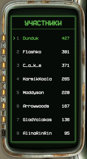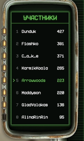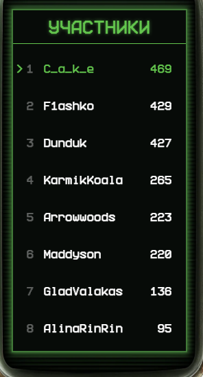 >>25827364 водолаз отказался, флешку на ненормову было бы норм заменить, ради интриги за последнее место, на остальных похуй, пусть кармик побеждает, выдачу очков за рогалики нужно пофиксить