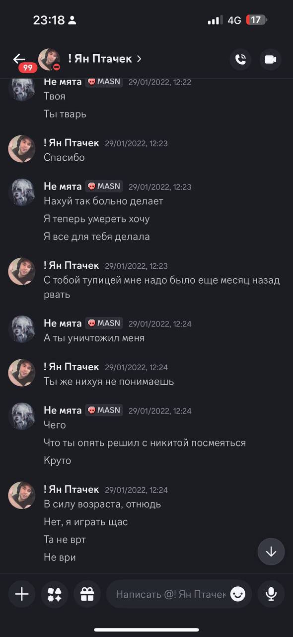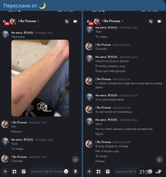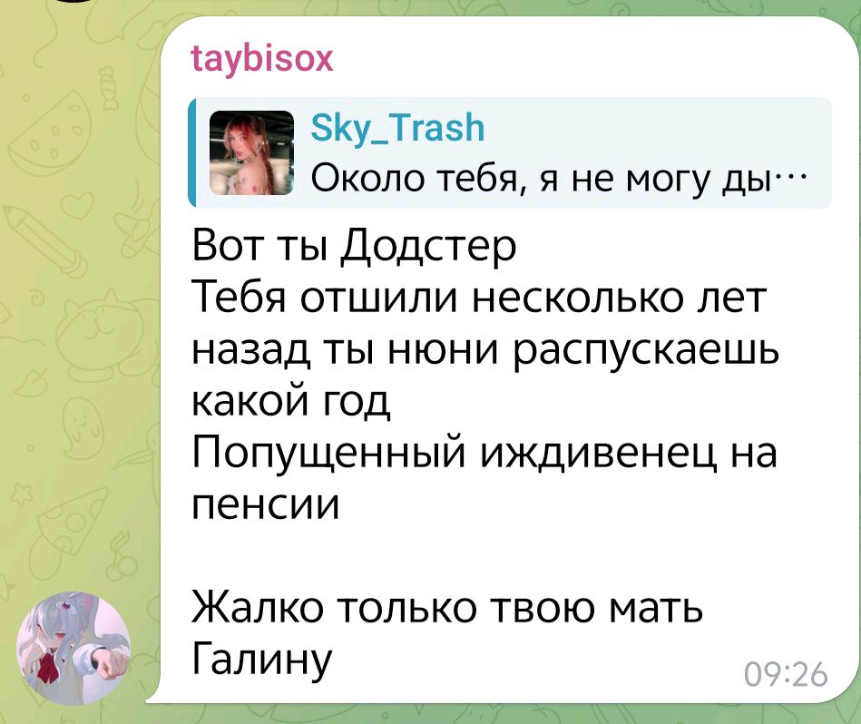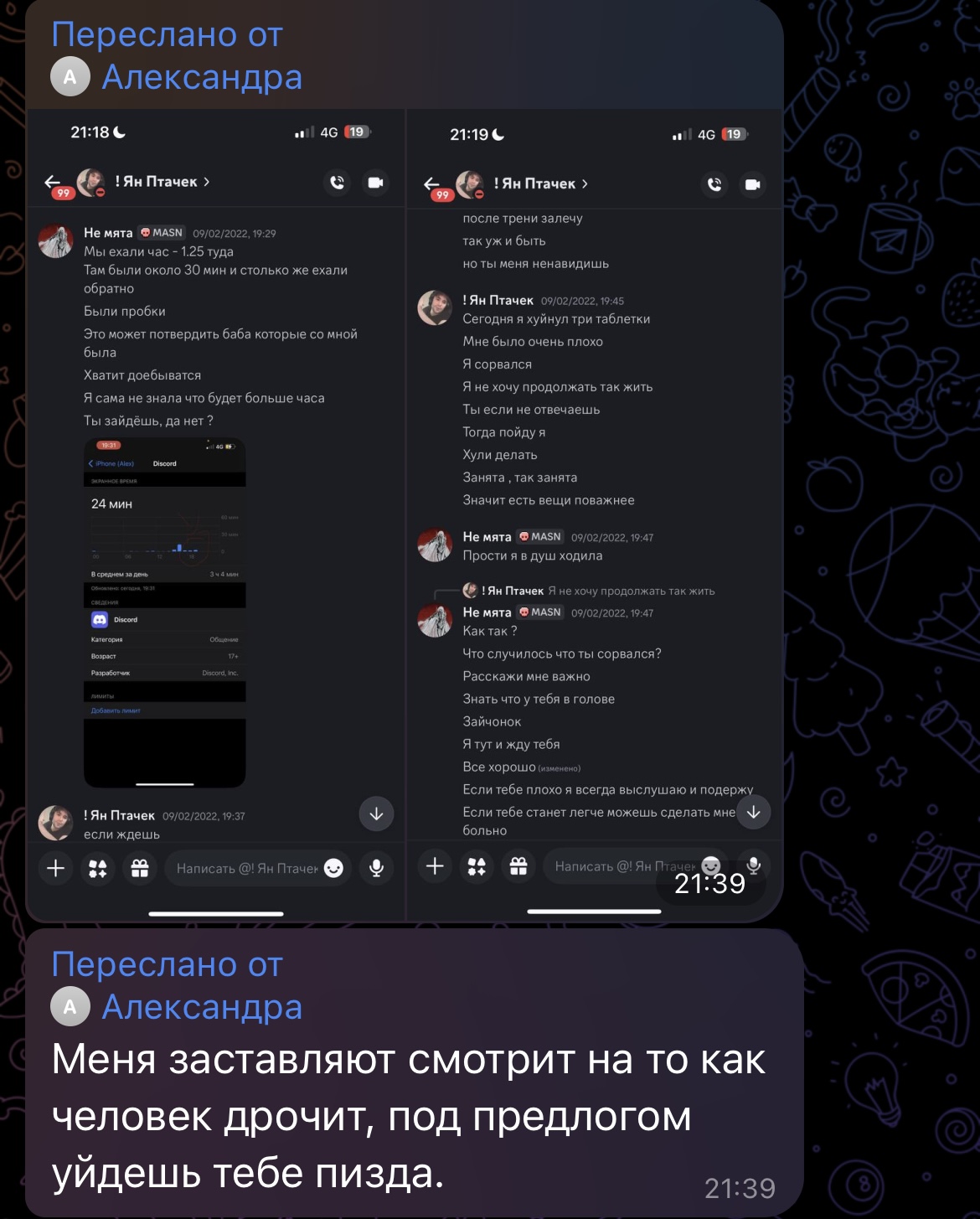 >>25835815 Она его жертва. Изза обиды просто преследует Настю и пишет анонимки на нее по наводке этого ебаря пропитого, подписалась @prostomyata и все что она тут высерала они с ним ей в полицию и Госнаркоконтроль спамили.
