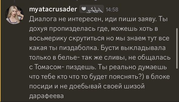 >>25835889 Предполагаю что т- это её вторе имя, не имеет значимого веса как отчество в снг странах, частая практика в Израиле. Только вот скажи зачем ты начала? По переписки понятно что ты ей явно что-то сделала… я её не защищаю, но все же мне кажется что не стоит её трогать. Израиль это не КЗ, ей вряд-ли что сделают, а как я понял девочка богата и проблем тебе создать может. В любом случае твое дело, но дам совет с Томасом делай что хочешь, а её трогать не надо, отпусти и забудь.