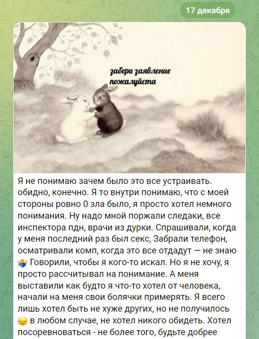 >>25835773 А ведь наверное правда, бегал за ними с телефоном, фоткал, это видели другие дети, стуканули. У него в тексте упомянут инспектор пдн, это значит по делам несовершеннолетних.