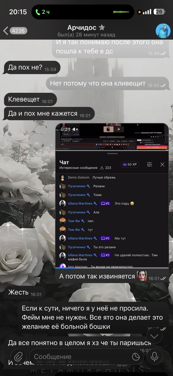 Тагир и другие лица не имеют к этому никакого отношения. С Тагиром я никогда не состояла в отношениях (он сам это может подтвердить). У Арчидоса я сидела исключительно как зритель и никогда не скрывала наличие парня. Германика угрожала «испортить мне жизнь» - вероятно, имела в виду двач, хотя я там особо и не сижу.