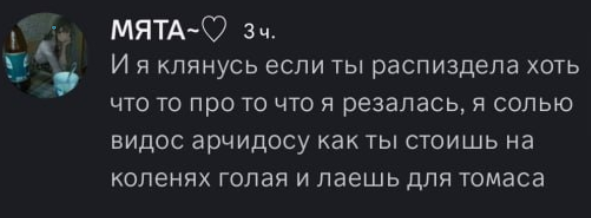 Такая лицемерная мразь, ты обосрала с ног и до головы, Томасом и Никиткой. Ты навсегда будешь с клеймом психички суицидницы. Скоро разенганс и вся его компания о тебе все узнают, зай. Ты будешь вместо него гонимым чмом хахаха