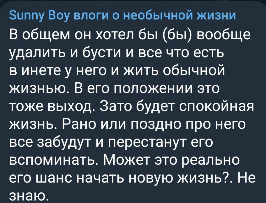 А я понимаю толчмо, сам бы я никогда не хотел становиться публичной личностью даже за большие деньги. Лучше простым РАБочим биодроном быть, чем быть на постоянном виду у десятков тысяч человек, которые всё про тебя вынюхают. Просто он слишком поздно к этой простой мысли пришёл из-за задержки в развитии.