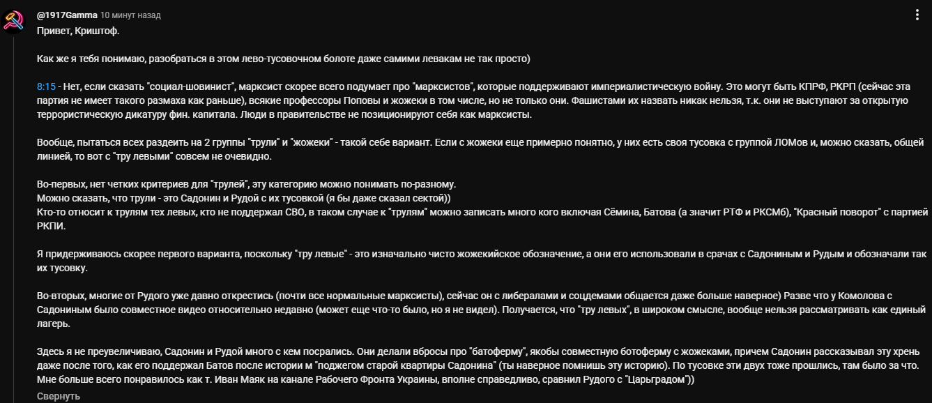 >>25893238 Думаю он сильно пробуксовал сначала из-за Стаса, который в 21 его репутацию извалял в дерьме, а потом из-за кагарыча, как приблеженный. Тем более у него был большой перерыв в медийной деятельности с конца 22 до начала 24 в его тг довольно мало постов и чем он занимался в то время трудно установить (все, что я помнж, что он успел побывать в Российском херсоне до отступления войск). На ютубе у него перерыв был еще больше чуть ли не с времен ссоры со стасом и до февраля 24. И замечу, стас его до сих пор пытается подтапливать, он натравил буквально свою аудиторию на Краса Мазова (соведущего потапенко), да и где-то в этот период у него был идеалогмческий кризис, плюс выпусные курсы, где-то тут он разочаровался в Марксе и вообще отошел от марксизма весьма сильно, даже дальше чем кагарыч