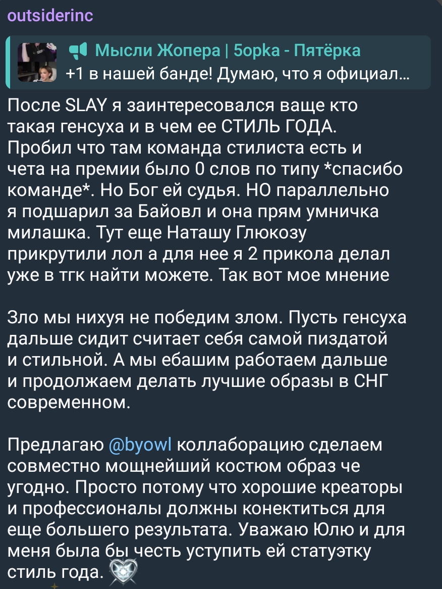 >>25861138 Байовла это старая несчастная женщина, у которой никак не получаются счастливые отношения, ведь масик не торопится и даже близко не планирует делать предложение, как и заводить детей, ему интереснее бегать хвостиком за своим теневым парнем. Ну про то что Наташа успешнее говорить нет смысла, ведь только ее постоянно зовут на съемки, на мероприятия, она свободно путешествует половину года и может не зависеть от стримов, а не сидеть 24/7 за компом и выпрашивать донаты на фильмы. У Наташи хотя б жизнь есть, а не жизнь сурка и постоянная стагнация. Прекрасно видно зависть Овлы, ведь Наташка реально одним стримом с бывшим может Слей Квин залутать, а Байовл не выиграет никогда)