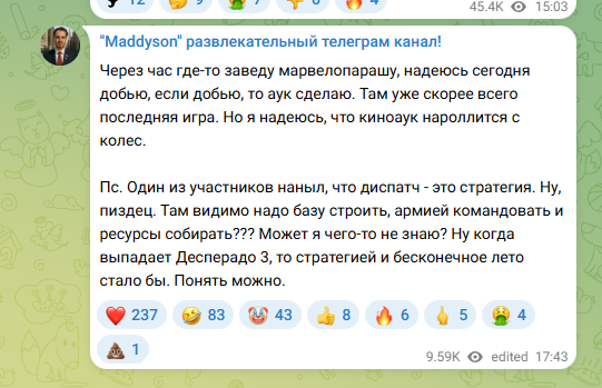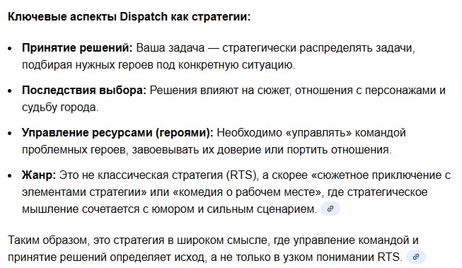 Пс. Один из участников наныл, что диспатч - это стратегия. Ну, пиздец. Там видимо надо базу строить, армией командовать и ресурсы собирать??? Может я чего-то не знаю? Ну когда выпадает Десперадо 3, то стратегией и бесконечное лето стало бы.
