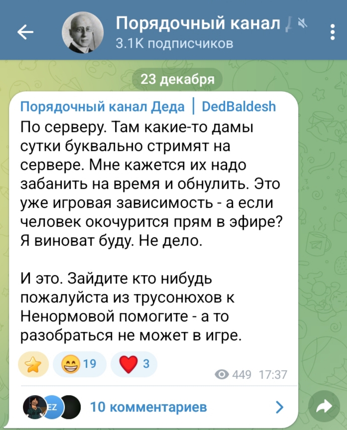 >>25863955 Лысое чмо забуханный в хлам как животное вместе с аудиорв ворвались в дискорд мета когда тот обкашливал бизнес вопросик с саней...в итоге чуть не спалив секретные документики был выгнан ссаной тряпкой+ проклят в веках+ выписан из подсосов
