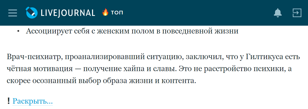 Прикиньте был такой паренек Денис Хамитов и ебануло ему в голову перевоплотиться в бабу. Начал гормоны жрать, волосы отрастил, красится, одевается в женское, пришил сиськи, накачал жопу, пишет о себе в женском роде и требует этого от других, но в душе то он МУЖИК, думает как мужик, сила как у мужика, голос как у мужика, хуй, скелет. Мрак..