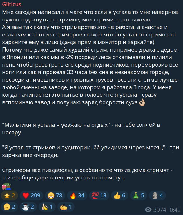 Чем меньше симпов будет в вареник вливать денег - тем лучше. Ситуация - селедка заходит на твич и ей за 4 часа капает твоя недельная месячная зп. Другие сельди смотрят на это и повторяют цикл. Дэн отобрал у них деньги, какая-то десятая часть процента стримерок попиздует на вайлдберриз.