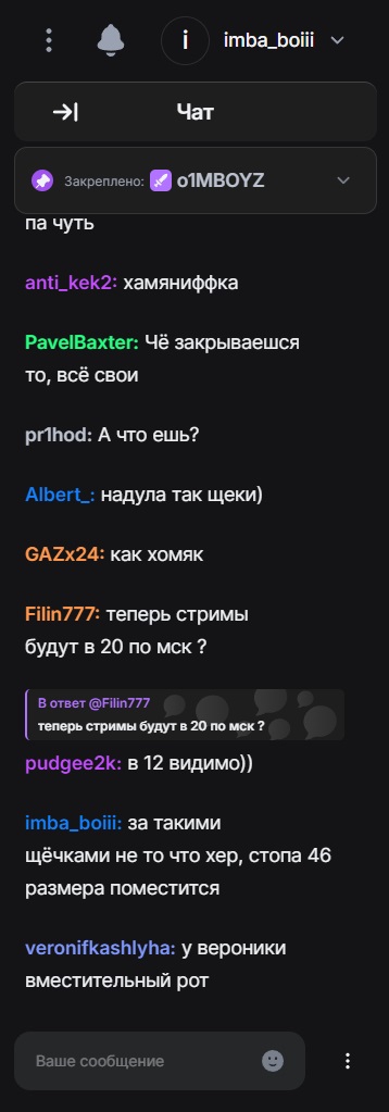 >>25867362 да блёва ваще долбаёб инфантильный. то кличку себе какую-нибудь придумает например "большой зи", то боссом себя называет. человек взрослый уже, а ведёт себя как ребёнок, еблан какой-то. и на стриме у него такие же долбаёбы пишут как он