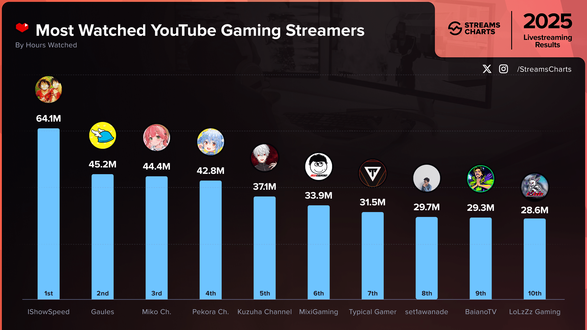 Авторы Streams Charts опубликовали рейтинг самых популярных игровых стримеров на YouTube по итогам 2025 года, основанный на внутренних данных сервиса.