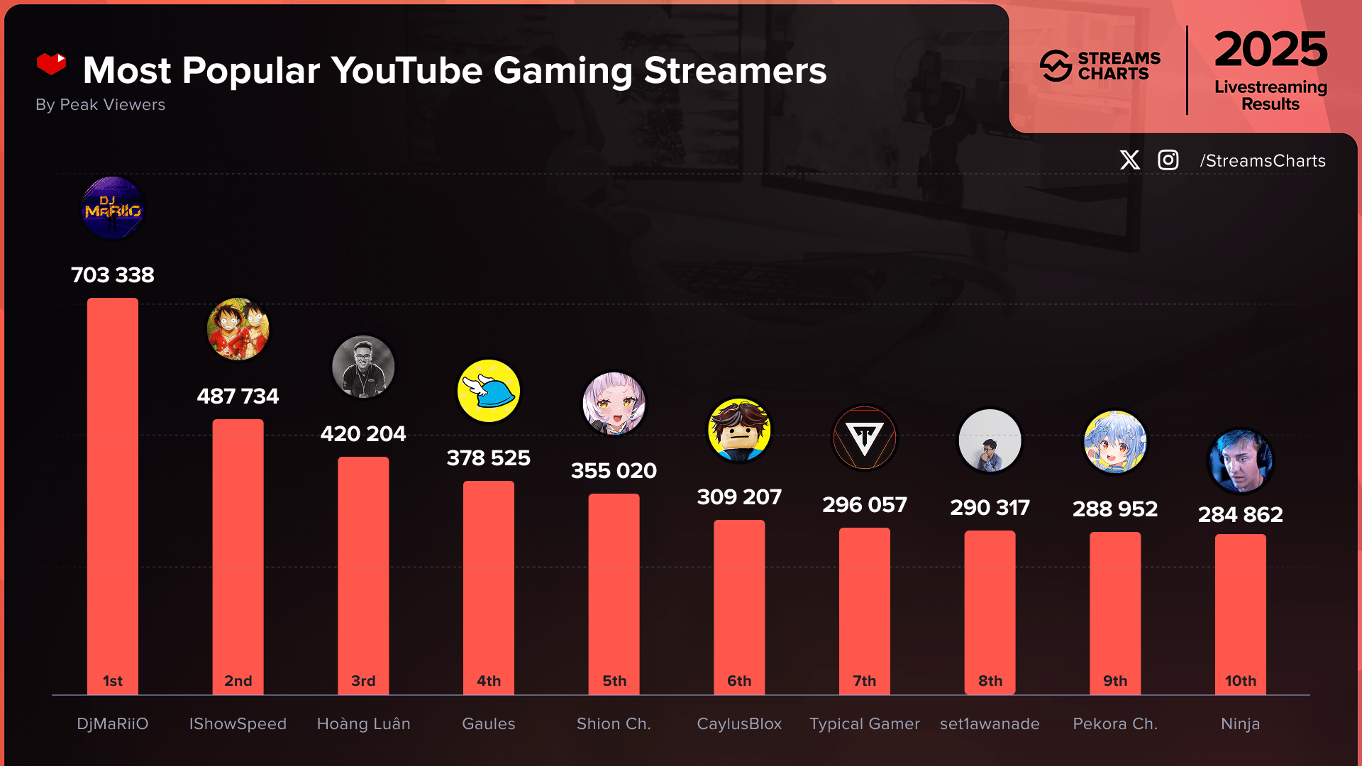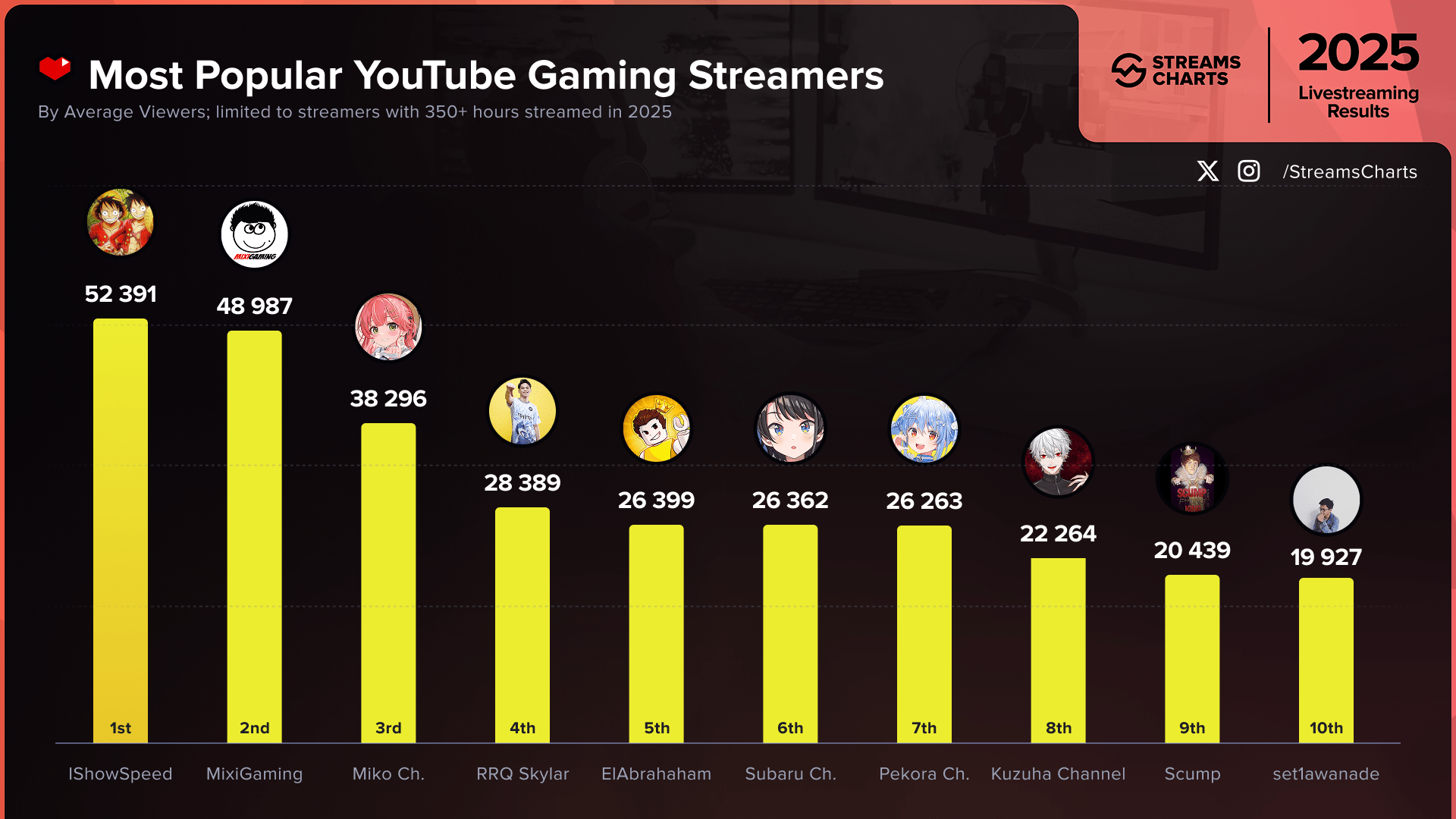 IShowSpeed также сохранил лидерство по среднему числу зрителей — онлайн его трансляций в 2025 году составлял около 52,3 тысячи человек.