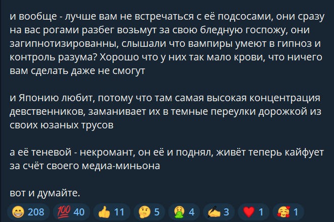 кстати вот если бы ей маньяк голову отпилил я бы даже руку пожал тому великому человеку, но почему-то такую мразь маньяки не любят, схожий вайбик типо, подобное к подобному?