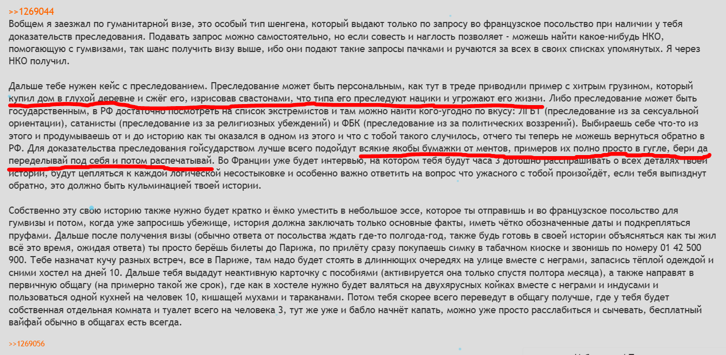 После этого надо хорошо заучить легенду и на собесах уже в самой Франции бойко её оттарабанивать (они пытаются сбивать с толку и ловить на противоречиях, но где там дуракам), что через некоторое время ведёт к получению аноном беженства и полному освобождению от необходимости ДЕЛОТЬ что бы то ни было и ДУМОТЬ до конца жизни.