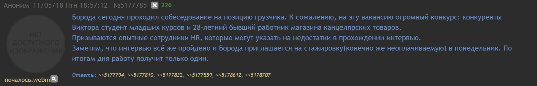>>26156508 Механик ходили с ним в мае 2018 на собеседования, однажды записали аудио. Эйчарша задала ему стандатный вопрос: "С какой целью захотели трудоустроиться именно в нашу фирму?" На что Борода иронично ответил: "Нууу....чтобы прикрыть наготу!.." Эйчарша процедила сквозь зубы, как Лавлес в "Диком, Диком Весте" "Я услышала вас..."