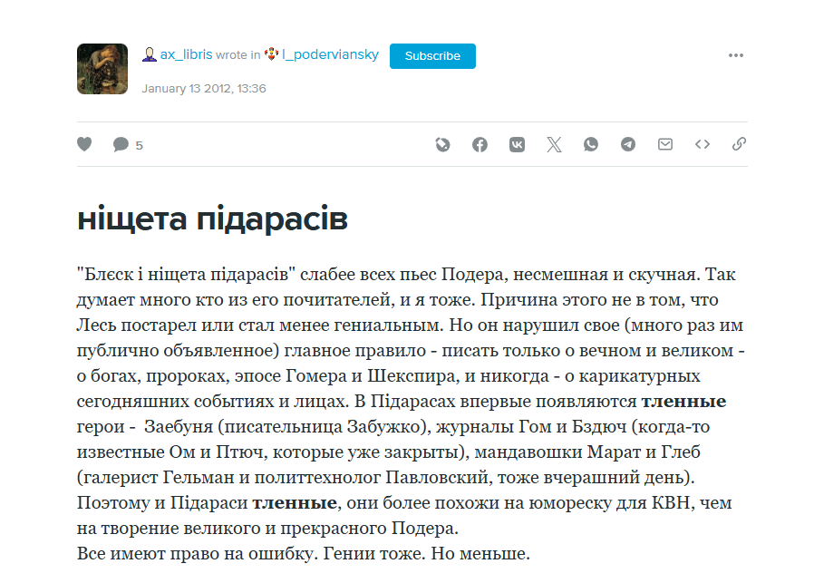 >>26155499 >осадила вся киевская богема во главе со светской львицей Заебуней, редакторы журналов "Гом" и "Бздюч",