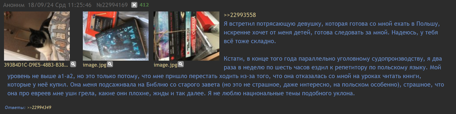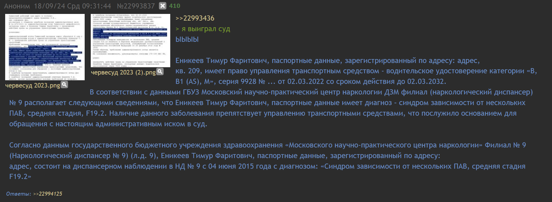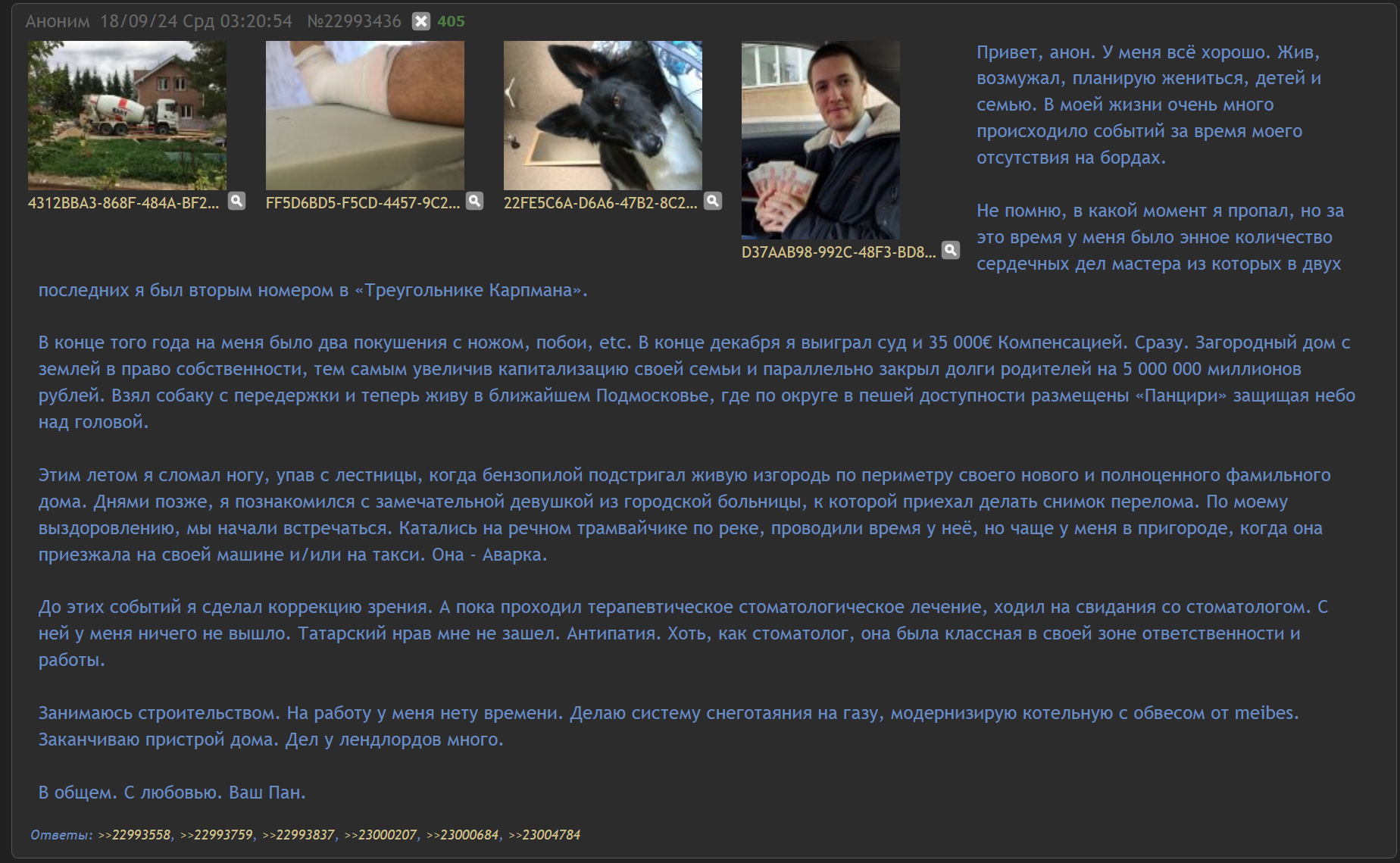 >>26154484 Тимур перебесился и вернулся в родную ДС-гавань, где у него родственники с крутыми связями. Последнее, что он писал, это морозная история, как он хладнокровно содрал с бывшего отчима 2,5 ляма отступных налом, за то, что тот слегка порезал пасынка по пьяни. Еще хвастался, что строит свой Дом-2 в Подмосковье и строит любовь с женщиной-врачом, дагестанкой по национальности, вероятно знойной и дикой красоты, как богиня Kira Queen, от которой у всего Дагестана полыхает как сопла супер-ракеты Илона Маска.